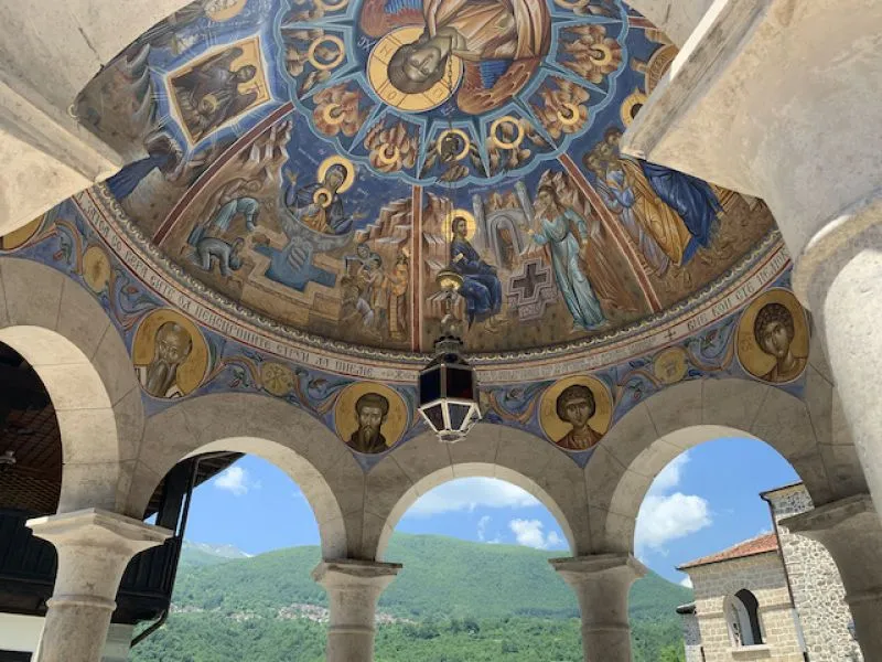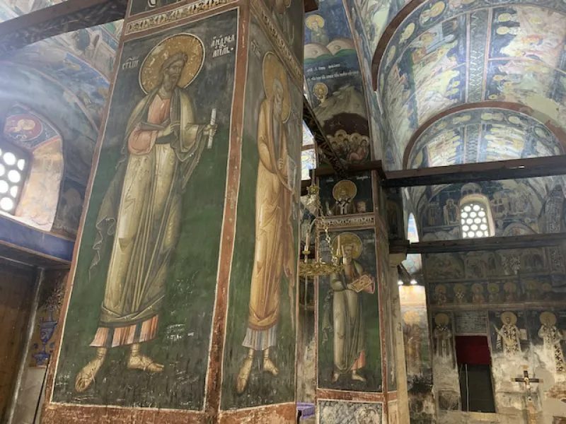 Dan volgt een van de hoogtepunten van de reis, het Vican Decani klooster, een van de mooiste kloosters op de Balkan. Het klooster is prachtig gelegen in de bossen met bergen op de achtergrond. Het klooster wordt zwaarbewaakt door een internationale troepenmacht, de kloosters zijn immers Servisch. Zodra we binnenkomen krijgen we ook een bericht op de telefoon ‘welkom in Servië’.  In het klooster zelf heerst een serene rust en als we de belangrijkste kerk binnenkomen, kijken we onze ogen uit. De hele kerk is bedekt met 14e eeuwse fresco’s, geïnspireerd door de Byzantijnse tijd.