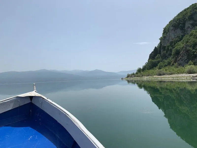Niet ver van het Meer van Ohrid ligt het de Prespa meer, op de grens met Macedonië, Griekenland en Albanië. Vanuit het dorpje Stenje maken we een boottocht over het meer naar het met vele legenden omgeven eiland Golem Grad. Ooit leefden hier monniken, het staat ook bekend als slangeneiland, maar is vooral de thuisbasis van honderden pelikanen en aalscholvers en andere watervogels. De boottocht duurt wat lang, maar we hebben ook te maken met extreme temperaturen, al twee weken boven de 40 graden. Bij iets koeler weer zou het een aangename tocht geweest zijn. In een homestay krijgen we door de vriendelijke eigenaren een lunch aangeboden met verse vis uit het meer.