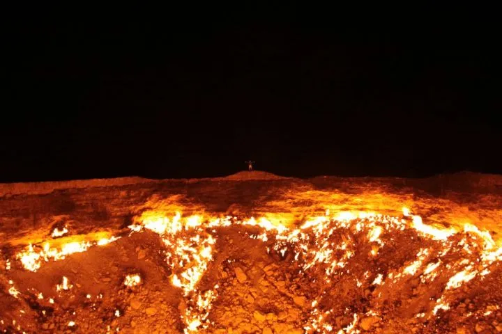 Turkmenistan is rijk aan grondstoffen als olie en gas. In de jaren ’70 werd er door de Sovjets naar gas geboord. Door een foutje van een van de geologen stortte de boel plotseling in elkaar en ontstond er een groot gat waar constant gas uitkwam. Men dacht dat er niet zo veel gas in de grond zat en besloot het aan te steken om het gas op te laten branden.... Gevolg... het brand nog steeds.