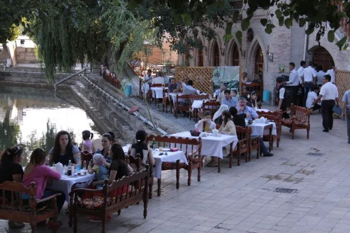 Net per comfortabele trein gearriveerd in Buchara en ingecheckt in het centrale Lyabi House hotel stap ik nieuwsgierig het Lyabi Khauz plein op. In de boekjes las ik al over kaart, back-gammon of domino spelende Oezbeekse mannen en gezellig kletsende families genietend van een heerlijke maaltijd langs het water. Lyabi Khauz betekent dan ook ‘om de vijver’. Het plein omringd door een aantal kleurige medrassas komt vroeg in de avond echt tot leven. Jonge gezinnen lopen met hun vrolijk aangeklede kroost langs de terrassen, of rennen achter hun kind aan die zich vermaakt in een miniatuurautotje.