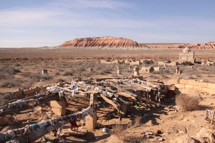 We keren terug om uiteindelijk bij het mausoleum van de legendarische Sufi leraar Gözli Ata in de pelgrimsruimte te overnachten. Naar zeggen kon hij in de ziel van mensen kijken en wordt zijn graf nog altijd vooral bezocht door jonge echtparen, gezinnen met een kinderwens. Ook hier een met linten versierde houten constructie voor vrouwen om onderdoor te lopen. Eromheen liggen tientallen mini-wiegjes om de wensen nog meer kracht bij te zetten.