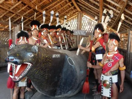 "Het hoogtepunt van onze reis (eigenlijk één van de vele hoogtepunten) was het Hornbill festival in Kohima. Aangezien Nagaland 17 verschillende stammen telt, organiseren ze ieder jaar begin december gedurende 10 dagen het Hornbill festival.