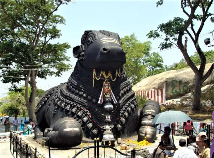 trappen naar beneden treft u een vijf meter hoog beeld van de stier Nandi aan,