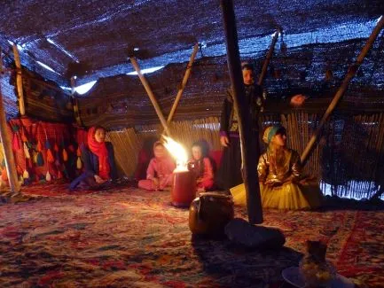 Ik zit in samen met Abbas aan de waterpijp, in zijn sfeervolle guesthouse in het dorpje Bazm, in de vallei van Bavanat. De enthousiaste eigenaar heeft zijn boerderij omgebouwd tot een soort mini-dorp met allemaal verschillende stijlen, van traditionele kamers waar je op de grond slaapt in lemen huisjes, tot comfortabele kamers met moderne faciliteiten. Of wil je liever in een nomadentijd slapen? Geen probleem! Dit allemaal omgeven door een prachtige tuin, vol rondscharrelend pluimvee. Net heerlijk vegetarisch gegeten (uniek in Iran's kebab cultuur), organisch allemaal uit eigen tuin, en heerlijk bereid door z'n vrouw. De plek is, zoals Abbas blijft herhalen, 'magical'.Tegen zonsondergang heeft hij ons meegenomen naar een hogergelegen vallei waar de Khamseh nomaden van mei tot oktober hun tenten neerzetten. Karakteristieke zwarte tenten van geitenhaar. Dit geitenhaar zorgt ervoor dat als het regeht (wat hier overigens zelden voorkomt) het water geabsordeerd wordt en het altijd droog blijft in de tent. De nomaden zijn feitelijk semi-nomaden, want hebben twee vaste verblijfplaatsen, deze en 's winters bij de Perzische Golf. Er staat hier ook een huisje en een schooltje, hetgeen het een beetje een soort van nomadendorop maakt. We worden vriendelijk welkom geheten en krijgen thee van zelfgeplukte kruiden. Nog een paar weken en dan gaan ze verkassen, de rijkere families laden de huisraad op een truck, de armere trekken met hun kudden in 25 dagen zuidwaarts. Ook de sterrenhemel boven de vallei was magical.