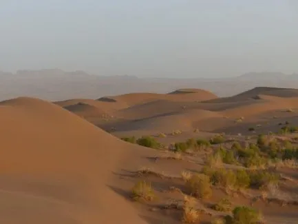 De lunch gebruiken we in Garmeh. Hier heeft de karakteristieke eigenaar een sfeervol guesthouse van zijn huis gemaakt. Zo'n typische plek waar overlanders veel langer blijven hangen dan ze van plan waren, een 'home away from home'. Edoch, die tijd heb ik helaas niet en ik rij verder naar Mesr. Wederom door een betoverend desolaat landschap, dat met het licht van de ondergaande zon alleen maar mooier wordt. Rondom Mesr een woestijn zoals je een woestijn voorstelt, met rollende zandduinen. Ik maak een wandeling over de richels van de hoge zandduinen, geniet van het zicht over de woestijn, de stilte en de ondergaande zon.