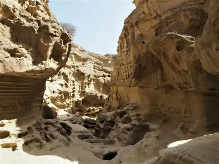 We vervolgen onze weg en komen aan in de Chahkooh Canyon waar een vriendelijke jongen ons met zijn Engelse studieboek staat op te wachten. Samen lopen we het pad af naar de rotsen terwijl hij ons vol enthousiasme Engelse grammatica regels dicteert. De kloof is prachtig – zandstenen rotsformaties  van honderd meter hoog gevormd door erosie. We lopen door de smalle gleuf in de rosten en koelen ons af met water uit een bron. Onze volgende stop is de scheepswerf waar nieuwe schepen gebouwd worden en oude schepen op het droge liggen. Onderweg komen we hordes loslopende kamelen tegen. Ons hotel ligt aan het water waar we heerlijk over het strandje kunnen struinen op zoek naar schelpen onder het genot van verschillende smaken Bavaria 0.0% biertjes geïmporteerd uit Nederland; smaken die we thuis nog nooit hebben gezien.