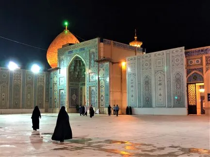 ’s Avonds bezoeken we het mausoleum  Shah-e-Cheragh. In dit monument met prachtige pleinen en moskeeën bevinden zich de graven van de gebroeders Amir Achmed en Mir Mohammed. We melden ons bij de ingang en worden opgehaald door een gids. Als vrouw ga ik door de vrouweningang waar ik gefouilleerd word en mijn geleende ‘chador’ aantrek. Dit is een gewaad dat me van het topje van mijn hoofd tot mijn tenen bedekt. Alleen mijn gezicht is nog herkenbaar. De tour is heel interessant en de binnenkant van de moskeeën zijn prachtig. Vooral in de spiegelmoskee kijken we onze ogen uit. Vroeger werden de spiegels voor de rijke Iraniërs uit Europa geïmporteerd en braken vaak tijdens de reis. Omdat ze niet zomaar een nieuwe spiegel konden bestellen werden de scherven als luxe decoratie gebruikt. Onderweg terug naar ons hotel komen we langs de Ark en op het pleintje is het een drukte van jewelste. Er wordt druk geposeerd voor het ‘I love Shiraz’ bord, er is een bandje aan het optreden, er wordt maïs gegrild, shisha gerookt en lekker gekletst op de bankjes of in de grasveldjes tussen de paden. Typische Iraanse gezelligheid.