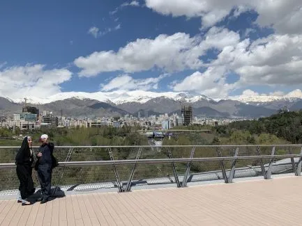 Een van de nieuwe hotspots van Teheran is de natuurbrug. Nog maar enkele jaren open en nu al een van de topattracties van de stad. Een moderne voetgangersbrug met meerdere verdiepingen verbindt een stadsdeel met een park. Er zijn overal bomen gepland, bloemperken aangelegd en ik heb, op deze zeldzaam mooie voorjaarsdag, een prachtig uitzicht over de besneeuwde bergen. Teheran is tegen het Alborz gebergte aangebouwd en op een zonnige, heldere dag krijgt de stad opeens een heel aangename blik, zeker vanachter de kersenbloesems in het park bij de Natuurbrug.