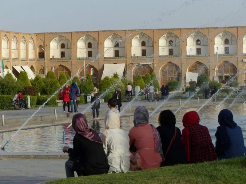 "Vlak bij het Khomeiniplein in Isfahan - een enorm plein, dat in de volksmond bekend staat als 'de halve wereld' - huur ik een fiets. Dat kan op veel plekken in de stad, bij speciale stalletjes. Ik fiets naar de brug met drieëndertig bogen – de Si-o-Se Pol Brug - waar ik mijn fiets parkeer. Rustig wandel ik over de brug. Mensen stoppen me om een praatje te maken; een aantal jongeren nemen selfies met mij. Aan de overkant loop ik onder de brug door. Er is een familie aan uit Yazd aan het pootje baden. Ze knopen een gesprek aan, en nodigen me uit om bij hen te komen zitten.
