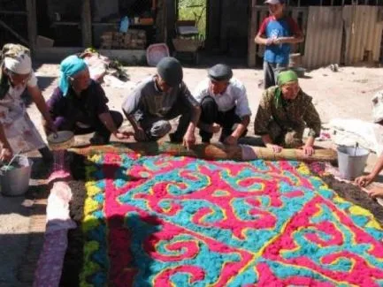 De Kirgiezen wonen traditioneel in yurts, vilten nomaden tenten. Deze ronde tenten worden van binnen versierd met vilten tapijten, de ala kiyiz. Tijdens een demonstratie leert u hoe deze vilten tapijten gemaakt worden, het hele proces van vilt maken, kleuren, tapijten rollen en de traditionele patronen die gebruikt worden. Op diverse plaatsen in Kirgizstan kunt u zo'n demonstratie meemaken.