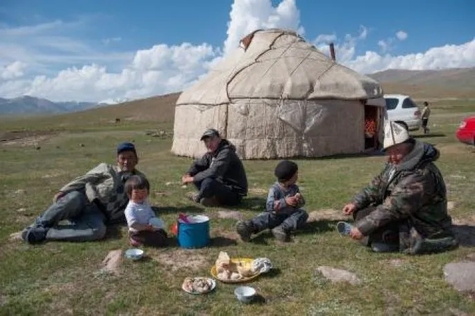 Een vrije dag bij het Son Kul meer. Als u rondwandelt zult u zeker uitgenodigd worden om eens kennis te maken in een yurt. U zult zien dat yurts van binnen vaak prachtig bekleed zijn met vilten tapijten. Achter in de yurt liggen dekens en matrassen opgestapeld. De hele familie slaapt ’s avonds in de yurt, soms wel meer dan 10 personen. Recht tegenover de ingang is de tör, de plaats waar de belangrijkste gasten zitten. Rechts hiervan zitten de mannen, links de vrouwen. In de meeste yurts bevindt zich een primitieve keuken, hoewel het ook voorkomt dat er een aparte yurt als keuken gebruikt wordt. Terwijl de mannen de kudden beheren, jagen en bij elkaar op bezoek gaan, bakken de vrouwen grote ronde broden en koken ze kezmeh (noedelsoep) in de kazan, een grote ronde ketel. Daarnaast worden de koeien en merries gemolken. Vooral de melk van merries is belangrijk voor de Kirgiezen. Drie keer per dag gaat men met veulens naar de merries om te melken. De melk wordt gekarnd en vervolgens worden er diverse producten van gemaakt, waaronder koumis. Deze licht gefermenteerde merriemelk is voor Kirgiezen de favoriete drank, die ze dan ook veelvuldig nuttigen en hun gasten ten alle tijde aanbieden. Van de melk wordt ook kaimak (vette room), surumai (gekookte boter) en airan (yoghurt) gemaakt.