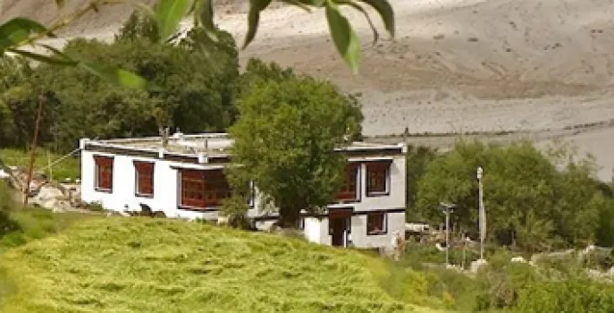 U verblijft enkele dagen in een eco-lodge en leert zo het 'echte 'Ladakh kennen. De lodge ligt in een vallei waar twee majestueuze bergketens elkaar ontnoeten: de Himalaya en de Karakoram. De lodge ligt in het midden van een oase, te midden van groene velden, bosjes van wilgen, populieren, wilde rozen en tamarisk. Het rustgevende geklater van bergstromen is alom te horen. De lodge ligt in een serene omgeving voor iedereen die het wild wil zijn op ongebaande paden. Het is ideaal voor gezinnen, stelletjes, natuurliefhebbers, vogelaars, en degenen die willen op wandelingen, trektochten, paardrijden en kameel rijden. U kunt deelnemen aan het ploegen, zaaien en oogsten van gerst en het hoeden van de yaks aan de hoge weiden in de lente.