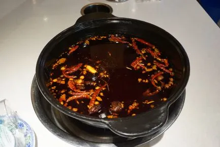Chinezen, ziet de inhoud van de hotpot pan er haast angstaanjagend uit! Een rode borrelende hete soep waar vele