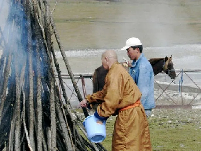 U rijdt verder door de heuvels, ziet kudden schapen en geiten, enkele gers. Langzaam ziet u steeds meer naaldwouden, kenmerkend voor het noorden, dat grenst aan Siberische taiga. U passeert enkele ovoo's, stapels stenen met gebedsvlaggen die zich bovenop bergtoppen, passen, maar ook bij meren of heilige bomen bevinden. De natuur wordt geëerd, een sterk sjamanistische invloed. Het sjamanisme is juist in deze regio het sterkst; hier wonen Tsaatan, Buryat en Darkhaad. Na drie uur rijden bent u in Khatgal, een klein dorpje aan de zuidkant van het meer. Nog even door het bos rijden en dan strekt het meer zich voor u uit; een schitterend gezicht. Het Khovsgol meer is een enorm uitgestrekt meer en een van de grootste zoetwaterreservoirs ter wereld. Het meer en omgeving zijn enigszins vergelijkbaar met het wat verderop gelegen Baikalmeer. Langs het meer ziet u naast gers ook vele blokhutten staan; Siberië is nabij. Ook ontdekt u enkele teepee's, de verblijfplaats van de Ysaatan; de rendiernomaden. Deze bevolkingsgroep, waarvan er nog maar slechts zo'n vierhonderd leven in Mongolië, wonen eigenlijk verder in de Darkhad depressie, zo'n drie dagen trekken vanaf het meer. Enkele Tsaatan zijn echter met hun rendieren naar de oevers van het meer getrokken om zo te hopen wat geld te verdienen aan het toerisme; een logische gedachte gezien het armoedige en zware bestaan dat ze leven in de Mongoolse taiga. Maar wel een keuze die helaas funest kan zijn voor de rendieren; de blaadjes die zij eten groeien hier niet en veel rendieren overleven het dan ook niet bij het Khogsvol meer.