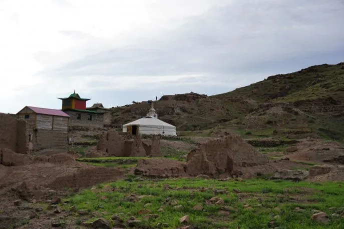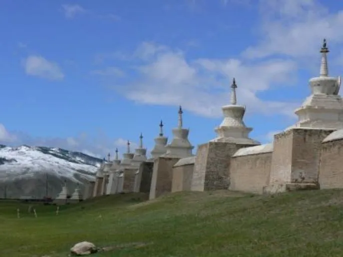 U vervolgt uw tocht en komt na een goed uur rijden op iets wat zelfs op een echte weg lijkt. Maar zoals het echte nomaden betaamt rijdt iedereen naast i.p.v. op de weg. Op de graslanden kun je tenminste helemaal je eigen pad volgen. Na ruim 3 uur rijden bereikt u Kharkorin, ooit de beroemde hoofdstad van het Mongoolse rijk, beter bekend als Karakorum. Nu een klein plaatsje met wat vervallen industrie. Maar ook beroemd om het Erdene Zuu klooster; het grootste van het land. U bezoekt het klooster met z'n beroemde kloostermuur van 108 stupa's en z'n vele tempels. Aan de rand van het klooster, dat opgebouwd is uit stenen van Karakorum, ligt een eenzame stenen schildpad, het enige dat rest van het ooit zo fameuze Karakorum.