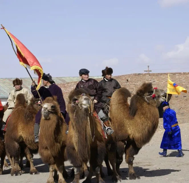 Vandaag maakt u het kamelenfestival mee, waar de trotse inwoners van de Gobi hun kamelen tonen en in vol ornaat kamelenwedstrijden organiseren. Hier komen veel inwoners op af. Het kamelenfestival is opgezet om de bactrische kamelen te beschermen. De populatie is de laatste jaren steeds verder afgenomen. Dit Tienduizend Kamelenfestival (tumen Temee festival) moet inkomen genereren voor de kamelenherders wiens traditionele bestaan steeds meer bedreigd wordt. Het festival vindt plaats in Bulgan in de zuidelijke Gobi. Het festival begint met de traditionele parade van de kamelen en hun trotse berijders. Ook vinden er demonstraties plaats hoe kamelen getraind worden en polowedstrijden met kamelen. Rondom het festival is ook een markt waar de nomaden hun traditionele producten verkopen. Índien de tijd het toelaat proberen we ook wat van de Gobi te zien. Zo kunt u naar Bazanzag, zo’n twee uur rijden. Bij de beroemde rode zandstenen rotsen van Bayanzag werden in 1922 de eerste dinosauruseieren gevonden door de Amerikaanse paleontoloog Roy Chapman. Ook vind hij vele dinosaurusbotten, het overtuigende bewijs dat hier ooit dinosaurussen rondstruinden. Nu is er een klein museum gewijd aan de dinosaurussen van Bayanzag.