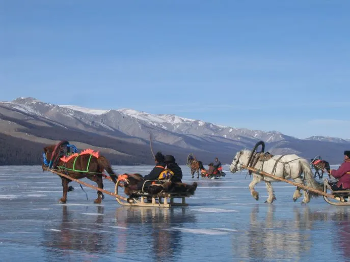 Een korte vlucht brengt ons naar het Khovsgol meer, gelegen in de Mongoolse taiga. Dit prachtige meer is helemaal bevroren in de winter. Er vinden diverse activiteiten plaats op en rond het meer, waaronder traditionele dansen, sjamanistische dansen en er is zelfs een heuse schaatswedstrijd. Het is een prachtige ervaring om met een arrenslee over het bevroren meer te rijden.