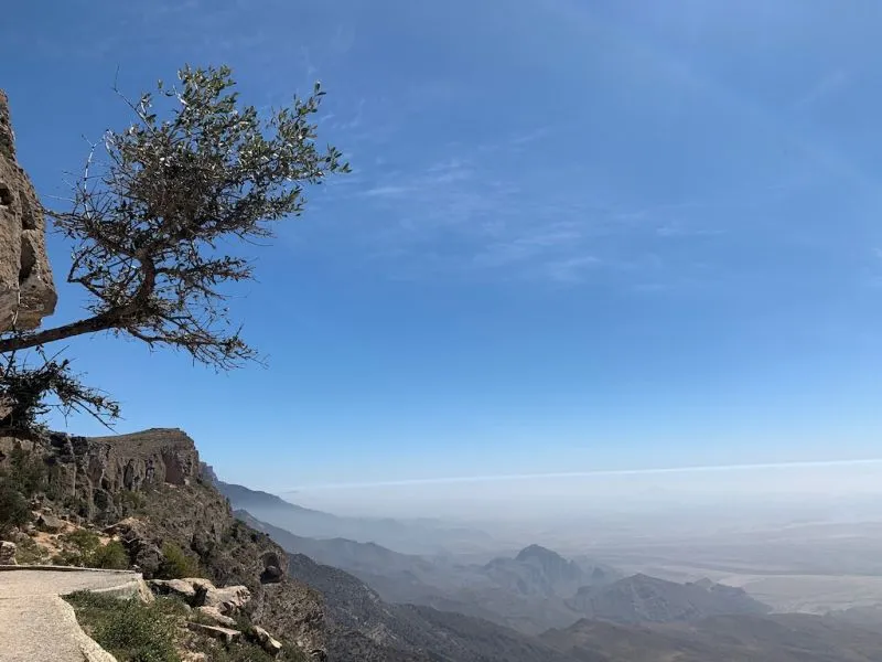We rijden weg van de kust naar het plateau van de Jebel Samhan. Dit is een natuurreservaat waar de zeldzame Arabische luipaard rondstruint. Die zullen we niet zien, wel vele kamelen en koeien die hier grazen. En in het dorre landschap staan een paar verdwaalde baobabbomen en staat de prachtige woestijnroos in bloei.