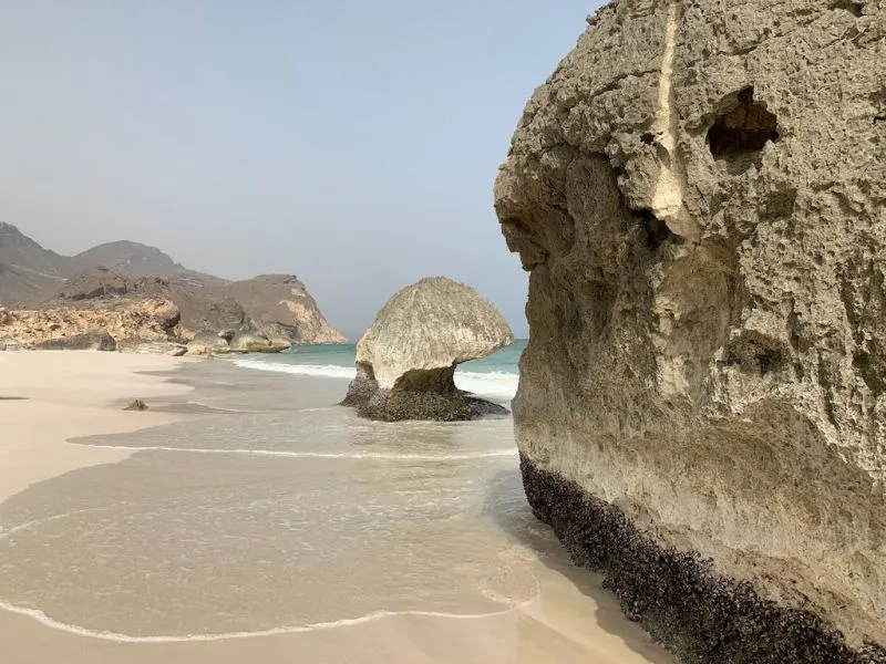 's Ochtends vroeg op om te genieten van de zonsopkomst over de zandduinen. Een wandelingetje maken, een ontbijtje in de woestijn. En dan breken we het kamp af. We rijden de zandduinen uit en komen in een dorre grindwoestijn terecht. Hier vinden we zoutkristallen op de grond. Off road rijden we over eeuwenoude tracks door de woestijn, af en toe een klein dorpje, tot we weer bij de bergen zijn. Over de bergen verder tot we de zee weer zien. En dan dalen we af, naar een van de mooiste stranden hier in het zuiden van Oman; Fayzayeh beach. Een paar kamelen struinen er rond, een enkele visser en verder overal mooie baaien met verlaten witte stranden.