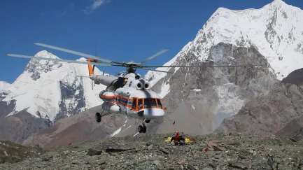Een helikoptervlucht naar Zuid Inylchek Basecamp. Dwars door de imposante sneeuwpieken naar het hart van het Tien Shan gebergte op 4000 meter hoogte. Hoe ruig wil je het hebben? Vanaf het kamp heeft u overweldigend uitzicht op de ijzige Khan-Tengri-top (7010m) en de Pobeda-piek (7439m).