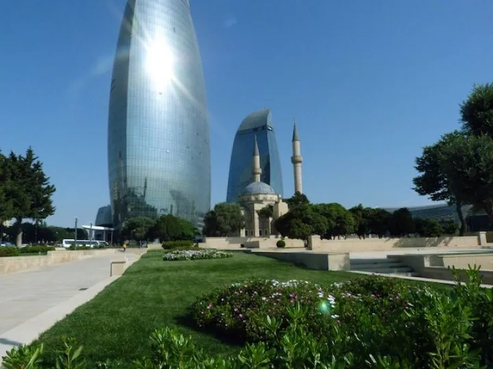 Terug in Baku maken we kennis met de moderne stad en bewonderen de nieuwe blikvanger van de stad. Drie recent ontworpen gebouwen die drie eeuwige vlammen moeten voorstellen en die de skyline dominant bepalen. Zeker ’s avonds als ze prachtig in wisselende kleuren verlicht worden. We wandelen door het winkelcentrum met z’n vele art nouveau gebouwen, fonteinen en parken en flaneren langs de boulevard met uitzicht op de Kaspische Zee. Het is overal een drukte van belang en aan het wagenpark is goed te zien dat we in een welvarende stad rondlopen. Na een traditionele Azeri maaltijd in een oude karavanserai bewonderen we Baku by Night. Een prachtig gezocht; kosten noch moeite zijn bespaard om een Bright Lights, Big City gevoel aan deze stad te geven.