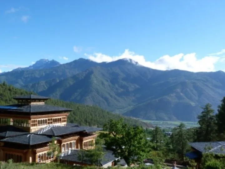 Ik bewonder haar enorm om dit succes. Het hotel ligt boven de Paro vallei, uiteraard met een schitterend uitzicht. Het prachtige hotel met 34 kamers waaronder suites in vier prachtige bijgebouwen, is helemaal gemaakt van natuurlijke materialen. Geheel van hout opgetrokken op Bhutanese wijze zonder een spijker te gebruiken. Gebouwd door de Bhutanese bevolking. De muren tussen het hout is traditioneel opgetrokken uit leem. De verf is natuurlijk materiaal. De stoffen die gebruikt zijn voor de meubels en gordijnen zijn van grif katoen of wol. Alle stoffen met natuurlijke zachte kleuren. Het eten komt van de velden van de lokale bevolking. De bediening komt uit de omgeving en is persoonlijk opgeleid. En zelfs de weg naar het hotel is door Sonam en haar staf zelf aangelegd. De dorpen onderweg zijn hierdoor ontsloten.