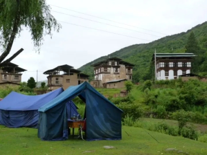 Ik word wakker in een blauwe tent. Niet op een matje maar op een heus bed. Het kampement bestaat uit vier tenten. De tent voor de keuken en de kok, de eettent, een slaaptent voor mijn Bhutanese begeleider en general manager van ons agentschap en dan de slaaptent voor mijn maatje en mij. Heerlijk geslapen met de geluiden van de velden en de bossen om me heen. Koebellen, het fluiten van tientallen vogels, kikkers uit de rijstvelden. Giechelende kinderstemmen. Ik steek mijn hoofd uit de tent en schrik bijna. Zo mooi is het vergezicht vanaf hier. Ik kijk uit over kleine rijstvelden en akkertjes met andere gewassen. De kleurschakeringen wisselen elkaar geleidelijk en met smaak af. Van fel lichtgroen naar donker, van middelgroen naar zachtgeel. Op de achtergrond figureren de prachtige Bhutanese houten huizen, twee verdiepingen hoog, met doorslaand succes. Het decor wordt afgemaakt met bergen opgesteld als coulissen. De contouren worden waziger hoe verder de berg zich bevindt. Ze worden versierd door witte uitgetrokken wolkslierten die als een aureool doodstil hangen om de vlakke bergtoppen. Ik kijk en zwijg.