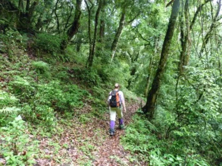 De klim is behoorlijk. Ik loop naar mijn gevoel zowat verticaal omhoog in zigzag. Het pad dat ik volg is een pad dat al eeuwen bestaat en gewoon dwars over een bergkam gaat. Geen pas te bekennen. Zo te zien lopen er maar weinig mensen want hetbpad was regelmatig moeilijk te vinden en begroeid met de meest prachtige planten, grondbedekkers en mooie bloemen. De weg stijl omhoog is vooral een uitdaging omdat het net heeft geregend en de grond glibberig is zodat ik regelmatig uitschuif en een stukje naar beneden glijd. Gelukkig een jungle van takken om me heen om me aan vast te grijpen als het dreigt mis te gaan, dus mij hoor je niet. Ik glibber lekker door. Dan zie ik een stok liggen die voor mij lijkt gemaakt. Deze stok begroeid met witgroene mossen wordt mijn vriend. Hij helpt me op glibberige stukken en wordt voor deze korte tijd dat ik deze steile helling ga overwinnen, letterlijk mijn steun en toeverlaat. Ik hou van mijn stok. Wat is het toch een grappig fenomeen dat op momenten dat de boel me even tegenvalt ik direct aan thuis denk. Ik zie het grijnzende gezicht van mijn zoontje en de stralende lach van mijn dochter en hoor de rustgevende stem van mijn partner en ik wil niets liever dan naar huis. Waar ben ik aan begonnen? Is dit nou leuk. Welke idioot rent hier een verticale helling op in hartje Bhutan? Ik herpak me als ik de stem van Jacomien hoor. Hoehoe! Klinkt het door de wildernis. Ik zie haar niet door de dikke vegetatie, ik zie helemaal niemand trouwens, maar door haar opgewekte stem die aangeeft welke kant ik op moet, kan ik weer verder. De weemoed verdwijnt voorgoed en met opgewekt gemoed en een ferme stap steven ik omhoog, vertrouwend op mijn vriend de stok.