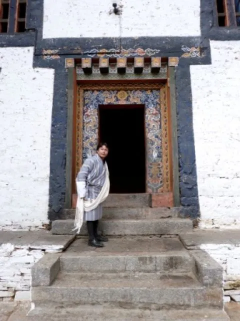 Karma legt me uit dat dzongs vroeger bewoond werden door gouverneurs of mensen van koninklijke bloede. En deze dzong is nog een van de laatste bewoonde dzongs door , ja wel, iemand van Koninklijke bloede. Het is de kleindochter van de broer van de eerste koning van Bhutan. We zijn nu toe aan de vijfde koning die is gekroond in 2006. Op een of andere manier is deze tak een verarmde tak van de Koninklijke familie geworden maar zeker wel een directe bloedlijn. Je zou haar kunnen zien als prinses Margaret, dochter van prinses Irene, die we nu gaan bezoeken. In Bhutan wordt ze aangesproken met de koninklijke titel Ashi.