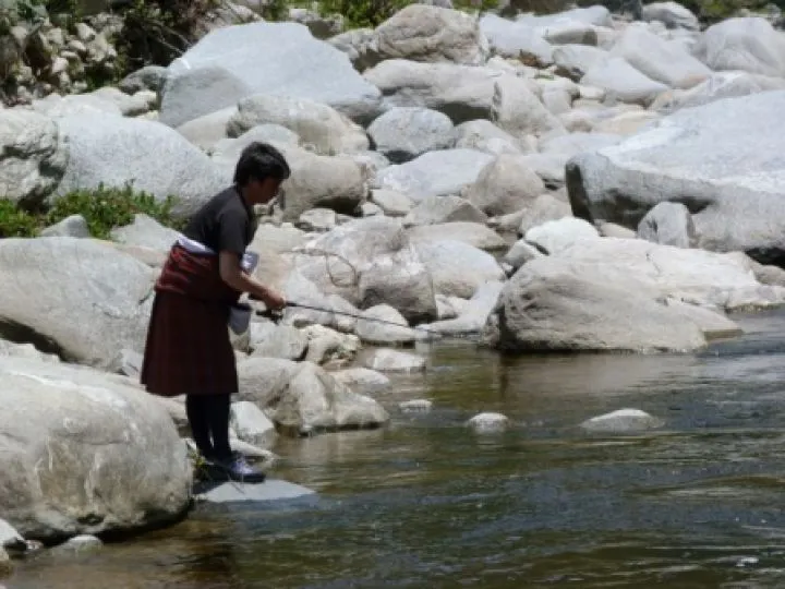Enthousiast haalt Karma zijn vishengel uit de landcruiser na mijn aansporing. Tijd om te vissen. Bij deze prachtige rivier. Een kolkende rivier met grote grijze rotsen. Hij draait zijn vishengel haastig in elkaar en springt als een gems over de grote rotsen naar beneden naar de rivier. Ik volg hem al even enthousiast. Jeemig wat is hier heet. Het zweet gutst in straaltjes naar beneden. Karma heeft zijn traditionele gho voor de helft naar beneden geslagen tot zijn middel. Ook hij vindt het hier zichtbaar bloedheet. Hij houdt zijn vishengel naar achteren en met de grote zwier gooit hij de vislijn met aan het einde een nepinsect in het water. De kunst is om de insect zover mogelijk te gooien, het liefst in de schaduw want daar zwemt de meeste vis. Daar staat ie dan. Op een grote steen omringd door water. Voorovergebogen hoopvol te staren op zijn insect de lijn binnen te halen. Hij verandert plots in een heel klein levend organisme middenin dit overweldigende landschapsdecor. Om hem heen hoge dichtbegroeide bergen, fluitende vogels. Bloeiende bloemen en de geur van citroengras. Hij gooit zijn lijn uit , haalt m weer binnen. Keer op keer. Hij roept iets naar me maar ik hoor hem niet door het geraas van de kolkende rivier. Wat zeg je? ' de lijn is te kort', denk ik er uit op te maken. En dan zie ik het ook. Zijn vislijn komt niet verder dan een paar meter. Nooit genoeg om de schaduw te halen waar de vis zit. Maakt niet uit. Het is toch prachtig, verzucht hij. En dan staat Kinsang alweer met de lunch klaar. En we hebben lunch aan de rivier uit een rieten mand met deksel.