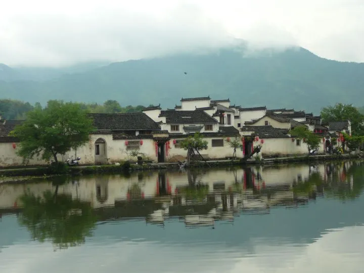 Er zijn vele zogenaamde filmdorpjes, misschien wel de bekendste film die hier is opgenomen is Couching Tiger, Hidden Dragon. Deze bekendheid zorgt ook voor veel bezoekers en daar was ik nou net niet naar op zoek. Gelukkig, in het volgende dorp geen touringcars en hier heeft de tijd echt stil gestaan. Af en toe passeert een bewoner op weg naar het veld en wij kunnen in alle rust door het dorp wandelen en naar binnen gluren. Elk huis is op eenzelfde manier gebouwd. Doordat het huis geen ramen heeft is er een groot gat (Quadrate dakraam) boven de entree. Op deze manier komt er licht binnen en zorgt het voor ventilatie. Hier staat ook vaak een grote vaas waar het regenwater in opgevangen wordt. Water is belangrijk en betekent 'good health' maar er moet ook altijd water voorhanden zijn om een brandje te kunnen blussen. Via het mooie dorp Pingshan met een prachtige familie tempel komen we uiteindelijk aan in Hongcun. Dit prachtige Unesco Heritage dorpje wordt drukbezocht dus wij besluiten eerst op de fiets te stappen en aan het einde van de middag, als het rust is weergekeerd en het licht prachtig weerkaatst over het water, het dorp te bezoeken.