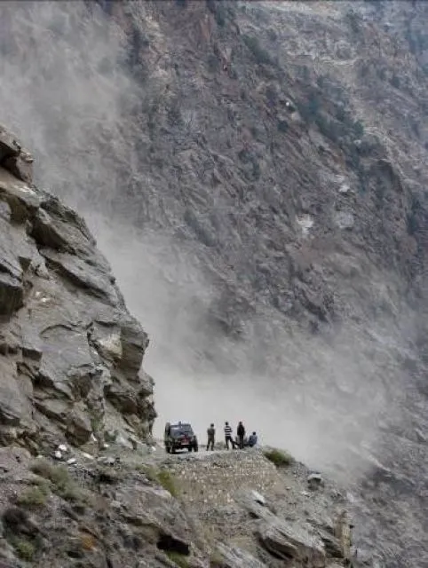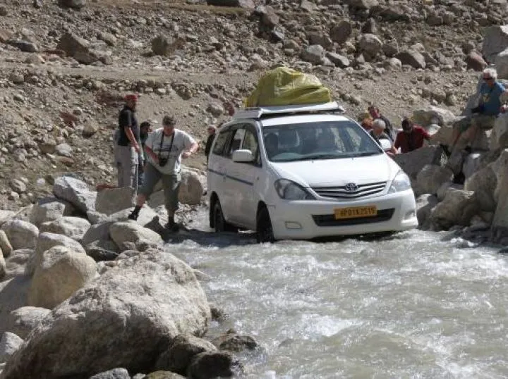 Regelmatig zeer slechte passages door watervallen over de weg. “This is true adventure”. Bij een grote waterval moeten we allemaal uitstappen en over rotsen of door het water lopen. Dus natte voeten, het water is erg koud, ik trek m’n sokken uit, maar door de ijskoude voeten krijg ik acuut diarree. De auto’s hebben veel moeite met passeren en de voorste heeft een lekke band. Er volgen nog een paar moeilijke passages en aan het einde van de prachtige Lahaul vallei beginnen we te klimmen naar de Kunzum pas (4551 m). Onderweg nog een tea-break bij een Tibetaanse tent, Dorje de baas vertelt trots dat hij en zijn vrouw in een winterse periode 106 mensen uit de sneeuw gered hebben, en toont ons de kranten met foto’s en de oorkonde die hij ontvangen heeft. Bovenop de pas staan een aantal stupa’s waar alle auto’s de kora omheenrijden alvorens de weg te vervolgen. Na een fotostop beginnen we aan de afdaling, de weg is nog net zo slecht. Ongeveer 18:00 uur staan we in Lossar bij het checkpoint om Spiti binnen te rijden, we zijn dan al 10 uur onderweg en hebben amper ¾ van de afstand afgelegd. De zon gaat onder en geeft een prachtige gloed op de bergen en de chauffeur start een bandje met Golden Oldies en zelfs Nederlandse muziek, die we uit verveling allemaal luidkeels meezingen. Na nog 2 uur rijden komen we in Kaza (3600 m) en slapen in het guesthouse bij het klooster. We zijn hier 1 dag eerder dan het reisschema en zullen de volgende dag dan Tabo en Dhankar bezoeken, nadat de chauffeurs de 2 lekke banden gerepareerd hebben. We hoorden net dat de weg tussen Nako en Tabo ook geblokkeerd is.