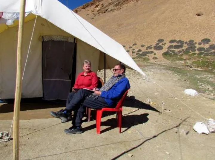 Ze brengen ons naar Tso Kar, een zoutmeer in de staat Jammu & Kashmir. Ze rijden eerst naar het verkeerde tentenkamp, weer inpakken en doorrijden naar Lotus Summer Camp, een keurig kamp met goede 2-persoonstenten, keurig schoon opgemaakte bedden en een eetzaal in een permanent gebouw. Kunnen we gezellig natafelen. Volgens de reisbeschrijving kamperen we op de oever van het meer, en kunnen we er zo even heen lopen. Maar kilometers verder is het meer nog steeds niet binnen ons gezichtsveld, dit is onbereikbaar.