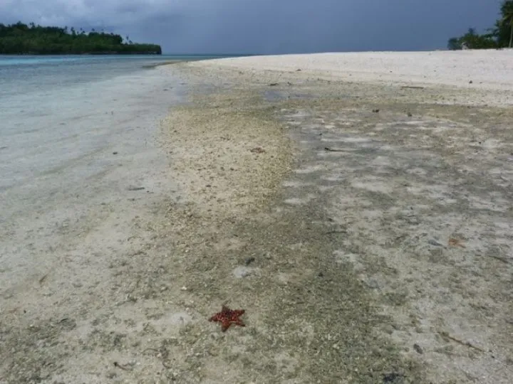 's Middags varen we verder langs de kust van Kei Becar. Helaas trekken er nog flinke regenbuien voorbij, maar eind van de middag kunnen we toch nog ergens stoppen bij een idyllisch eilandje om even te zwemmen en snorkelen. Het snorkelen is niet super, maar toch de moeite waard. Weer enkeke zeesterren en drie soorten anemoonvissen.