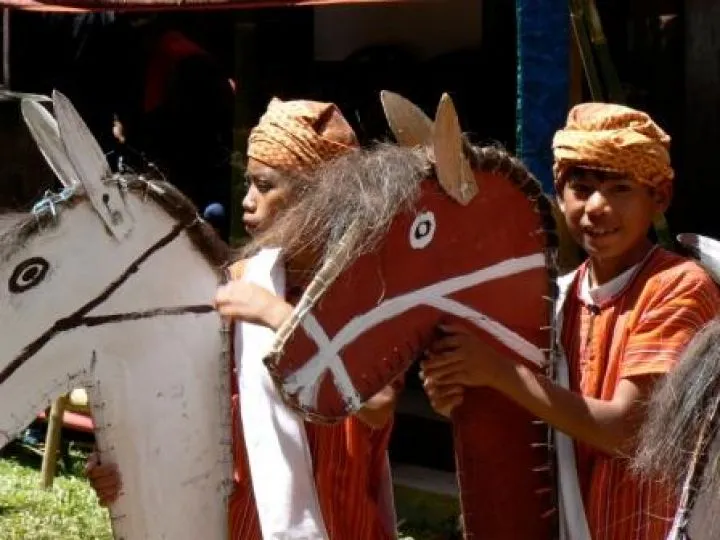 Het zwartharige varken ligt op zijn zij. Zijn blik op oneindig. Z’n natte neus wipt af en toe omhoog. Zijn buik gaat regelmatig omhoog en omlaag op zijn ademhaling. Poten vastgebonden met riet. Hij ligt een beetje onhandig op een aantal dikke korte groene bamboestokken. Vanuit de verte begint een broer van hem akelig hard en lang te gillen. Zoals alleen varkens dat kunnen. Het brengt hem klaarblijkelijk op een idee. Hij begint eveneens te gillen waarbij hij als een dolle zich probeert los te wrikken. Hij rolt halve slagen, trekt met zijn poten, schudt met zijn kop, maar het mag allemaal niet baten. De festivalgangers kijken niet op of om als hij probeert de aandacht te trekken. En dat is opmerkelijk voor een hoofdrolspeler. Hij ligt hier overigens niet alleen. Langs de kant van de weg, telt men zo 18 zwartharige babibabi. Het zijn giften van de lokale gasten aan de familie van overledenen waarvoor vandaag een grootse ceremonie is opgezet. Honderden gasten zijn van verre gekomen om een laatste groet te brengen aan twee overleden familieleden van een rijke Toraja familie uit het plaatsje Warante, vlakbij Rantepao in Tana Toraja. De twee familieleden zijn de moeder en de zoon die eerder dit jaar zijn gestorven. Hun lichamen worden bewaard in het houten huis van de familie zoals dat hier hoort. Dit houten huis of tonganan heeft een enorm dak in de vorm van een boot. Het is prachtig versierd met symmetrische inkervingen gekleurd met rood, geel, zwart en wit.