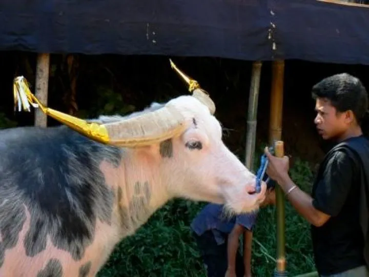Een touw in een stukje plastic slang loopt door zijn natte neus die een beetje scheef getrokken door dat zelfde stuk touw er uit ziet als een stukje zwarte natte klei. Zijn logge kop en een sterke brede nek laten niet met zich spotten. Zijn nek is zo breed dat er geen touw goed om heen past, vandaar maar een touw door de neus. Dat is tenminste de verklaring van zijn trotse hoeder die hem in de gaten mag houden. Zijn gigantische horens die ver uitsteken, eentje wijst overigens naar beneden en de andere naar de hemel, steken hun kracht niet onder stoelen of banken. Zijn witte ogen en witroze huid met grijze vlekken zien er een beetje aandoenlijk uit. Een albino buffel doet bij mij toch een beetje zielig aan. Maar niet bij de Toraja. Een albino buffel wordt vertroeteld. Het is de meest kostbare buffel die er bestaat in Toraja Land. Voor een sterke volwassen albino buffel wordt al gauw 100 miljoen Rupiah neergelegd. Dat is zo’n euro 60.000,-! Deze karbouwen worden dan ook verzorgd alsof het babies zijn. Ze worden uitstekend gevoerd met vers gras, er wordt dagelijks rondjes met ze gelopen alsof men de hond uit laat. Eenmaal daags krijgen ze een uitgebreid badritueel kado. En dat gebeurt meestal op het einde van de dag. De rivier ligt dan als een persoonlijke spa o ze te wachten. Lekker drijven in het water met af en toe een massage van de loopjongen. Letterlijk. Een ware Toraja-mercedes. De gewone donkergrijze karbouw mag er overigens ook zijn. Toch nog een slordige 40 tot 60 miljoen Rupiah wordt er voor betaald. Toch al snel zo’n eur 25000,- Een kalf kost eur 5 miljoen. Hoe krijgt zo’n beest dat ooit terug verdiend? Er moet toch iets anders onder het gras zitten, of in dit geval onder de rijst, dan het ploegen van de sawa’s? Het geheim wordt me verklapt door Cornelius, een Toraja jongen met een wel heel christelijke naam. De karbouwen waren van oudsher het betaalmiddel in Toraja Land. Dat is zogezegd een beetje uit de hand gelopen. Een Tonganan (het traditionele houten Toraja huis met een dak in de vorm van de onderkant van een boot) kost 4 a 5 karbouwen. Ook het varken wordt hiervoor gebruikt. Deze Toraja karbouwen staan helemaal niet meer voor de ploeg. Vandaag de dag worden de karbouwen gebruikt als gift aan de overledenen voor wie een ceremonie wordt gehouden. Op de laatste dag van zo’n ceremonie worden de kist naar de grotten gedragen en de beesten worden geslacht.