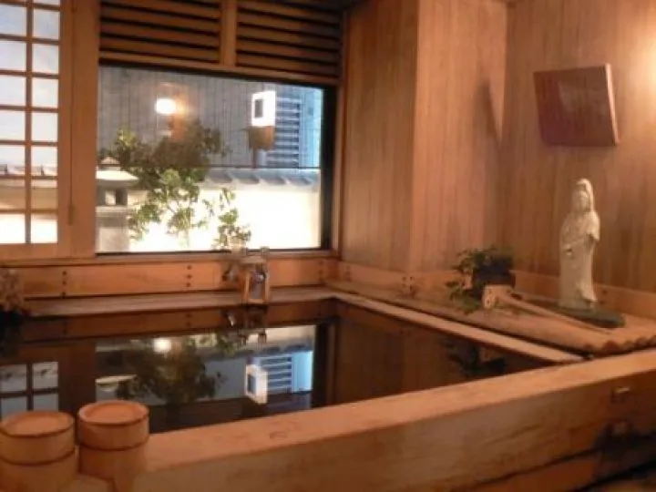 Het gezamenlijke houten Japanse bad in deze ryokan is een lust voor het oog en daardoor waarschijnlijk ook voor ziel en lichaam. Eerst schrobben op een houten krukje, afspoelen met napjes water en dan laat je je in het houten bad zakken met snoeiheet water. Handdoekje op kop.