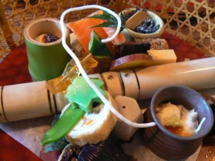 Mijn blik werd vastgehouden door het mandje met de Japanse hors d’oeuvre. In een theehuis annex restaurant in Ueno Parc. Om het nog pijnlijker te maken tegenover de beroemde picknick plek onder de bomen zwaar van kersenbloesem in de lente. Zo perfect van kleur, compositie en textuur. En het was aan mij om het op te eten. Wordt het er nou lekkerder van? Het doet pijn en het geeft vreugde tegelijkertijd. De zich sterk afwisselende smaken in mijn mond probeer ik zo lang mogelijk vast te houden. Een paar seconden van puur geluk!