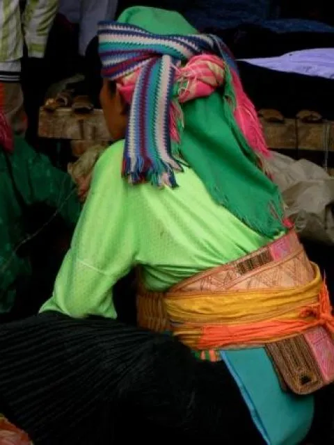 Hij zit bij de andere mannen. Mannen doen geen boodschappen. Die roken. En drinken. En eten. En lullen wat bij. Ze proberen hun dochters aan de man te brengen of er achter te komen of de zoon van de dochter van hun tante wel goed boert in de grote stad. Op de zondagsmarkt kom je even bij. Je laat je op je paasbest zien en geniet je van je vrienden en verre familie om je heen. De mannen dragen hier eigenlijk allemaal hun beste zwarte jakje met broek. De vrouwen dossen zichzelf uit met prachtige hoofddoeken, geborduurde sjerpen, zwarte plissé rokken en zilveren spelden. De jonge meisjes hebben de synthetische disco variant ontdekt. Sommige dragen synthetische jakjes van zilver. Anderen hebben een zilveren draad door hun hoofddoek en plissé rokken met honderden kleine bloemetjes erop gedrukt. Dit in tegenstelling tot hun moeders of oma’s die de traditionele kleding prefereren. Zij dragen als blauwe Hmong dan nog een blauwe schoot op een zwarte plissé rok en hebben een blauw jakje aan. Soms vervangen ze blauw door groen. Ook goed.