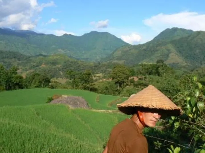 Hij draagt geen water, alleen dus die waarschuwende hoed. Ik voel de zon antwoorden op mijn haar, strak om mijn hoofd gebonden tot een staart. Op zijn slippers sloft hij in en slakkentempo voor me uit. Her en der een voorbijganger groetend en wat zinnetjes rond slingerend hier en daar geadresseerd aan hurkende dorpelingen die hem een veel of juist weinig betekenende blik toewerpen. Ik voel de ogen van de tanige mannen met gespierde benen en vierkante knokige knieën in mijn rug of eigenlijk billen prikken. Een westerse derrière van een vrouw van 39 lijkt niet op die van hun vrouw van 35, die dag in dag uit sjouwt met takkenbossen, aardappelen, rijdt en witte knollen. Kegelhoed volgt een pad, dat ik niet herken als een pad naar boven, de berg op. Het had de vorige dag flink geregend dus ik glibber weer net zo hard naar beneden. Hij kijkt een keertje om maar sloft gewoon door. Ik laat me niet kennen en ren de berg op. Het zweet gutst langs mijn slapen. Wat een waanzin dit! Ik weet vast wel hoe het hier allemaal uit ziet. Ik loop al 20 jaar door die godvergeten groene rijstvelden! Beetje groen, beetje rijst, beetje bananenbomen, glibberig paadje, bloedzuigers op je schoenen, een houten huis op palen met schamel tot geen meubilair. En dat in ruil voor kloppende slapen, zweet dat uit oksels en voorhoofd klotst en dientengevolge die verrekte jeuk die opkomt in mijn hals. Mijn benen die gaan trillen, een droge bek, hijgen als een paard en pijn in mijn schouders van die klote gifgroene rugzak. Ik voel de moed in mijn schoenen zakken. En krijg in een flits visioenen van mezelf met een koffie verkeerd een beetje luierend op het gras aan de kant van de Kromme Rijn in Amelisweerd. Volgend jaar blijf ik thuis!