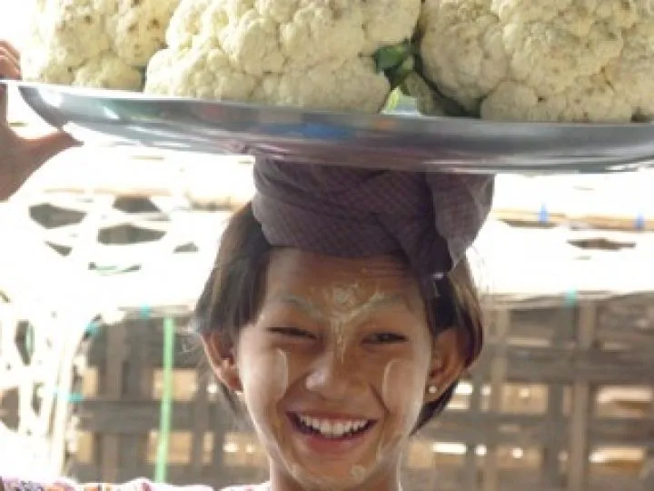 De meisjes, met hun vrolijk met thanaka bepoederde gezichten, kijken me nieuwsgierig aan. Ze zetten hun handelswaar even van hun hoofd af. Manden met tropisch fruit, maar ook met bloemkool staan nu op de loopplank naar de boten toe. Het is een komen en gaan hier van mensen die de ferry willen pakken.