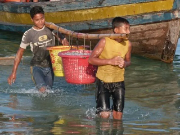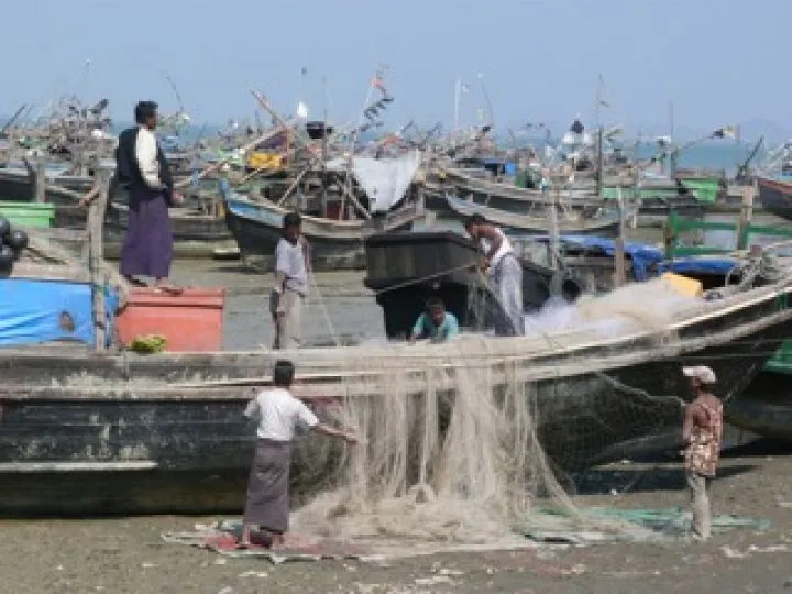Het leven vindt allemaal plaats langs de rivierkant. Overal zie je diverse soorten vissersboten liggen, van grote houten boten uit het nabijgelegen Bangladesh, tot kleine kano's met een zeiltje erop. Op de vismarkt heerst een heerlijke chaos. De mensen uit Rakhaing zijn duidelijk verwant aan de Bengalen, hun gelaat is veel donkerder dan dat van de Birmezen. Op de markt zie je enorme gedroogde vissen hangen.'s Ochtends vroeg komen de boten binnen met verse vis, zowel uit zout, zoet en brak water; een enorme variëteit aan vis dus. Rondom de vismarkt wordt van alles verkocht; bloemen, rijst, groente en fruit. Ik kijk m'n ogen uit. Een eindje achter de markt ligt de vrijdagsmoskee, een vervallen gebouw uit de 19e eeuw. Hier wonen veel moslims, zowel islamitische arakanezen als de rohingya's. Deze laatste bevolkingsgroep is verwant aan de Bengalen en wordt officieel niet erkend door de Birmese overheid. Ze hebben een zwaar leven en velen zijn inmiddels de grens over gevlucht.