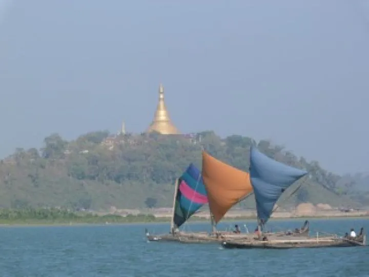 Het geratel van de motor van de boot is het enige dat het landschap om me heen verstoort. Ik passeer vissersboten met grote, vierkante zeilen, een groene oever waar waterbuffels grazen, zilverreigers in de bomen zitten, en af en toe een klein dorpje aan de horizon opdoemt. Ik vaar over de brede Kaladan rivier (zo breed dat het lijkt of je op zee vaart) van Sittwe naar Mrauk U. Oftewel van de nieuwe hoofdstad van Rakhaing naar de oude, middeleeuwse hoofdstad. Gister ben ik aangekomen in Sittwe, vroeger beter bekend als Akyab, net zo als Rakhaing vroeger bekend stond als Arakan. Een fantastisch stadje dat Sittwe. Niet dat er veel monumenten of historische gebouwen te zien zijn, het is het straatbeeld waarbij je je ogen uitkijkt. Waar in Rangoon het verkeer steeds meer toeneemt, zie je hier overwegend saiq ka's, de Birmese riksja, wat paardenkarren en af en toe een vervallen pick up truck. Hier zie je nog het authentieke straatbeeld dat in veel gebieden van zuidoost-azie steeds meer verdwijnt door de toenemende modernisering. Maar hier in Sittwe is het straatbeeld grotendeels gelijk aan hoe het er de afgelopen honderd jaar ook aan toeging.