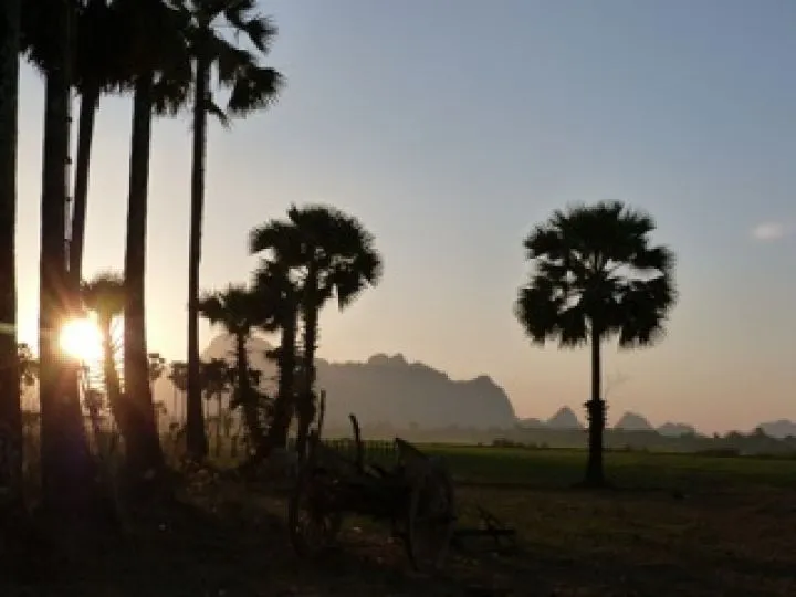 Ik verruil de Mon staat voor de Kayin staat. Onderweg van Moulmein naar Hpa'an wordt het landschap steeds mooier. Tussen de rijstvelden en rivieren doemen overal karstbergen op die het landschap, zeker bij zonsondergang een schilderachtige sfeer geven. Vele van de karstbergen herbergen enorme grotten. In enkele van die grotten staan tientallen, soms honderden boeddhabeelden, enkele al uit de 13e eeuw stammend. Vanaf de boulevard in Hpa'an heb je een prachtig zicht over de rivier met daarachter dit betoverende landschap. De Kayin struinen langs de rivier en zien de zon langzaam achter de horizon zakken. De Kayin staan bij ons beter bekend als de Karen. Dit volk heeft pas onlangs een wapenstilstand met het regime getekend en nog steeds zijn grote gebieden niet toegankelijk voor buitenlanders. Maar wie weet verandert dit allemaal, want er waait duidelijk een nieuwe wind door Birma. Onze chauffeur loopt de hele dag trots in een t shirt met Aung San Suu Kyi erop, iets waarvoor hij een jaar geleden nog zou zijn opgepakt. Hij vertelt me zelfs dat hij onlangs de persoonlijke chauffeur van 'the lady' was op haar verkiezingstocht door Birma. Trots laat hij enkele foto's zien. Zowel hij als mijn gids werken beiden als vrijwilliger voor haar partij en praten daar overal open en bloot over en hopen allebei op een betere toekomst voor dit land.