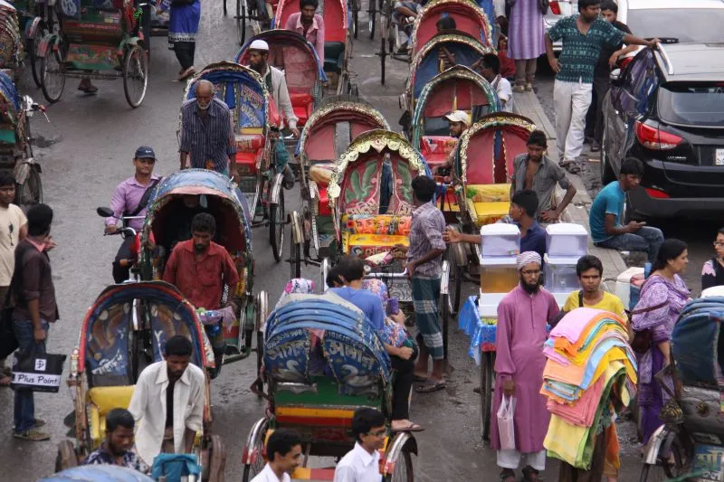 Hoofdstad Dhaka heeft zo'n 15 miljoen inwoners en is een duizelingwekkende heksenketel vol energie en bedrijvigheid. Dagelijks bewegen zich hier zo'n half miljoen fel beschilderde fietsriksja’s als kleurige golven door een eindeloze zee van verkeer. Welkom in de ‘Riksja Hoofdstad van de Wereld”.