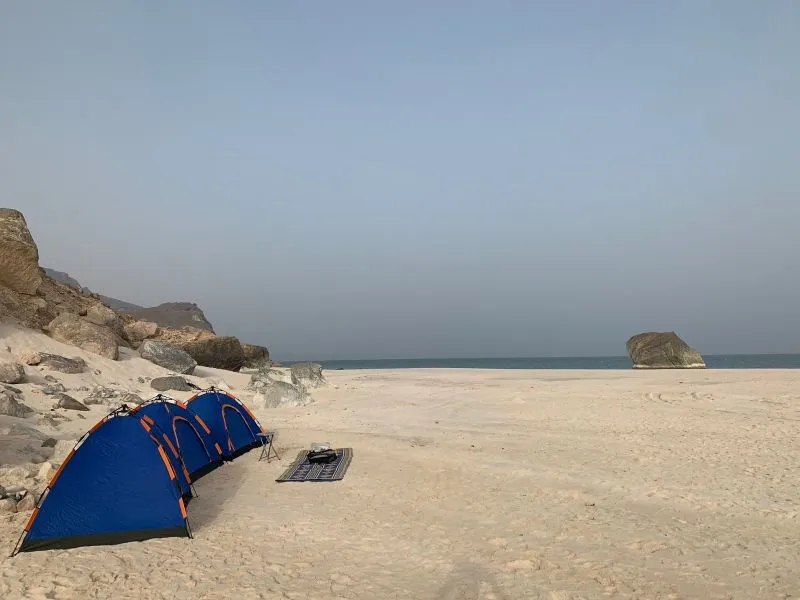 's Ochtends vroeg op om te genieten van de zonsopkomst over de zandduinen. Een wandelingetje maken, een ontbijtje in de woestijn. En dan breken we het kamp af. We rijden de zandduinen uit en komen in een dorre grindwoestijn terecht. Hier vinden we zoutkristallen op de grond. Off road rijden we over eeuwenoude tracks door de woestijn, af en toe een klein dorpje, tot we weer bij de bergen zijn. Over de bergen verder tot we de zee weer zien. En dan dalen we af, naar een van de mooiste stranden hier in het zuiden van Oman; Fayzayeh beach. Een paar kamelen struinen er rond, een enkele visser en verder overal mooie baaien met verlaten witte stranden.Hier slaan we onze tenten op; heerlijk een eigen strand, kamperen in het wild. We zwemmen in het warme water, maken strandwandelingen en genieten weer van een zonsondergang en een eindeloze sterrenhemel.