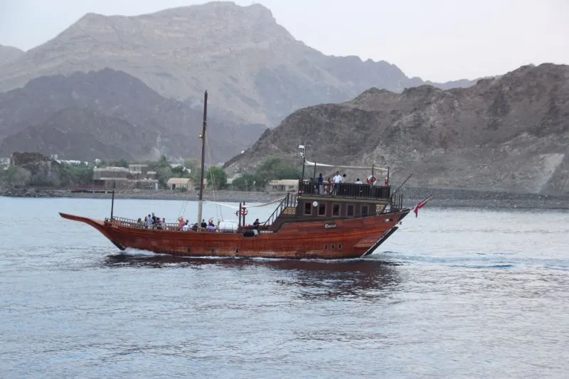 Landschappelijk een van de mooiste van Oman is het schiereiland Musandam alleen per vlucht te bereiken. Tweeduizend meter hoge bergen monden hieruit in de kristalheldere zee, ideaal voor snorkelaars en duikers. Vanuit de stad Khasab is zo'n prachtige boottocht per traditionele dhow door de fjordenkust mogelijk. Met zo'n dhow cruise geniet u de gehele dag van de spectaculaire fjorden van Musandam en de kleine vissersdorpjes aan land. Bij het beroemde telegraaf eiland bestaat de mogelijkheid om dolfijnen te bekijken. (Lunch geserveerd aan boord). Zwemmen en snorkelen mogelijk op deze cruise.