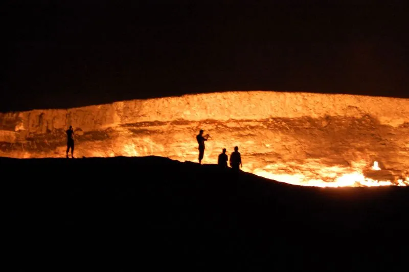 Geen natuurfenomeen, maar een foutje van sovjet-geologen. In de jaren ’70 werd hier geboord op zoek naar olie- en gas. Opeens stortte de grond in, men was op een ondergronds grottenstelsel gestuit en op een gasvoorraad. Het gas verspreidde zich door het grottenstelsel. De geologen dachten het probleem op te lossen door het gas op te laten branden en staken het wijselijk in brand. Het gas brandt nog steeds! Vooral ’s nachts levert dit een schitterend beeld op; de verlaten woestijn en de brandende vuurhaard. U U kunt hier kiezen tussen een gedeelde yurt of een privétent nabij de vuurhaard en geniet van een Turkmeense barbecue.