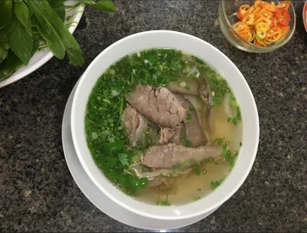 De bouillon die al enige tijd stond te pruttelen in een loeihete gietijzeren pan was erg goed op smaak gebracht. Hierin werden de rijstnoedels maar heel eventjes gestoomd tot ze zacht waren, om vervolgens het geheel in een kommetje te schenken en de Phó af te maken met lange repen rundvlees. De soep vormt een basis: het is dan ook totaal niet pittig van smaak. Je kan zelf (naar wens) chilisaus, zoute hoisin saus, chilipepers of limoen toevoegen; dit staat op elk tafeltje klaar. Doordat het een lichte soep is, wordt het meestal als ontbijt gegeten. Maar ook als je ziekt bent of koorts hebt, schijnt een kommetje Phó per dag de beste remedie te zijn.