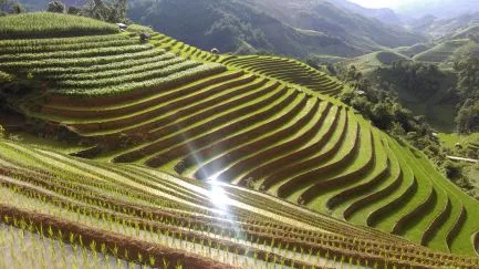 Hoewel ik al vele rijstvelden heb gezien, overtreffen de rijstvelden van Lan Pan alle anderen! De wandeling van zo’n vier uur begint met een korte klim over een verharde weg. Eenmaal afgeslagen verandert de omgeving en loop ik midden tussen de bergen die worden bedekt door een laag rijstvelden. De één nog groener dan de ander. We passeren dorpjes waar Hmong vrouwen in felgekleurde traditionele kleding ons begroeten. Kinderen lopen giechelend achter ons aan, spelen met een buffel of steken hun hand op voor een high five. Een vrouw loopt zelfs een stukje met ons mee de bergen in. Zij is op weg naar haar rijstveld. Hoewel we elkaar niet helemaal goed begrijpen, volgt er met behulp van onze gids een gesprekje. Het hoogtepunt van de wandeling volgt aan het einde van de tocht, wanneer we een schitterend uitzicht hebben over het “ronde rijstterras”, de trots van de Hmong.